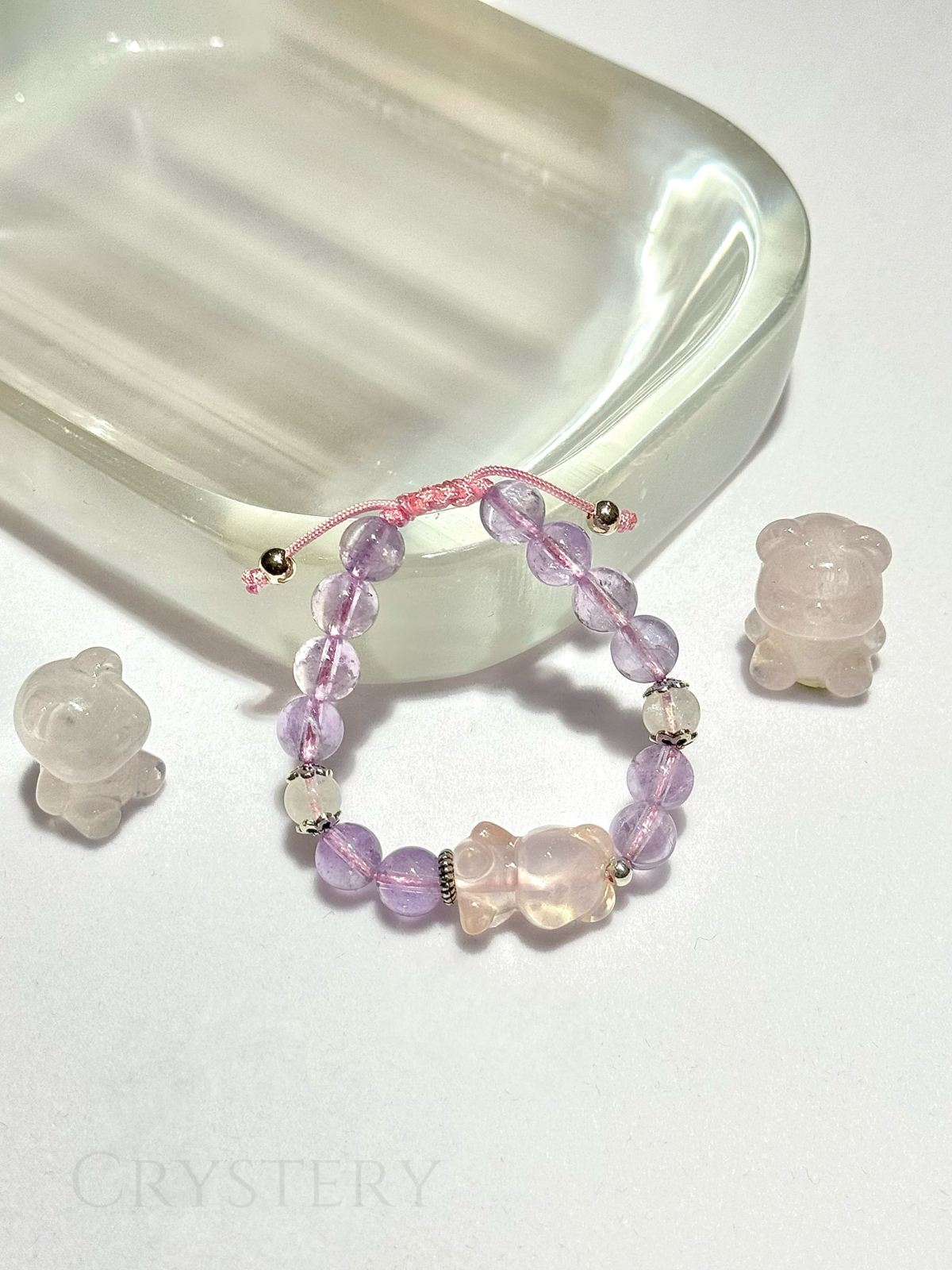 - 粉晶熊尺寸長約17mm ±0.5mm|薰衣草紫晶約6.5mm ±0.5mm|月光石約6mm ±0.5mm